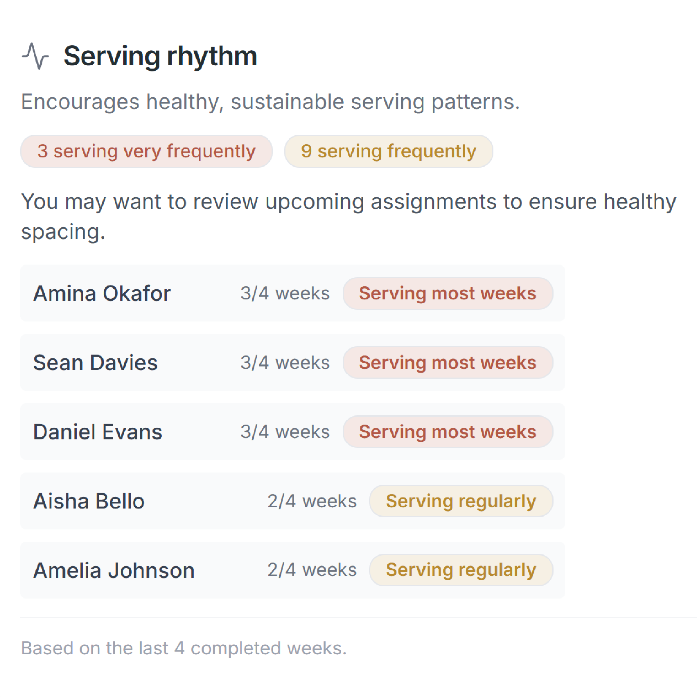 Cadence helps spread responsibility more fairly so teams can serve without becoming over-dependent on the same people every week.